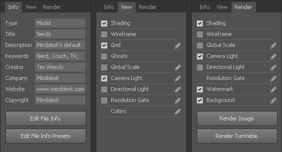 The other two tabs are listing various display options that you can toggle. By clicking on the pencil icon next to an option you can edit further display settings like watermark text or background colors. The settings made in the View panel affect the Work Area. With the Render tab you can adjust the render to file settings. Once this tab is activated you will see a preview of the render result.