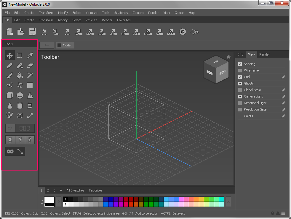 The Toolbar contains all available tools with global and individual tool options.