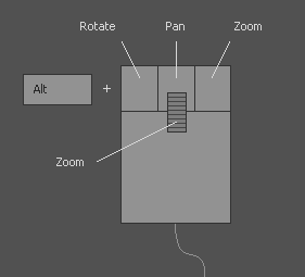 Hold down the Alt key and one of the three mouse buttons to rotate, pan and zoom.